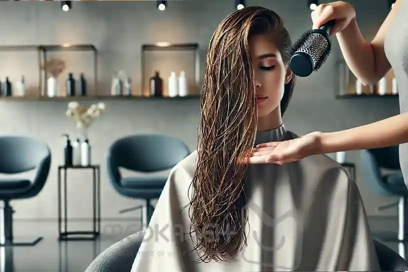 ۴. شستشوی نهایی و خشک کردن موها پس از مدت زمان لازم، موها شسته شده و با سشوار خشک میشوند. نتیجه نهایی، موهایی صاف، براق و ابریشمی است که به راحتی حالت میگیرند و جلوهای جذاب به چهره شما میبخشند.